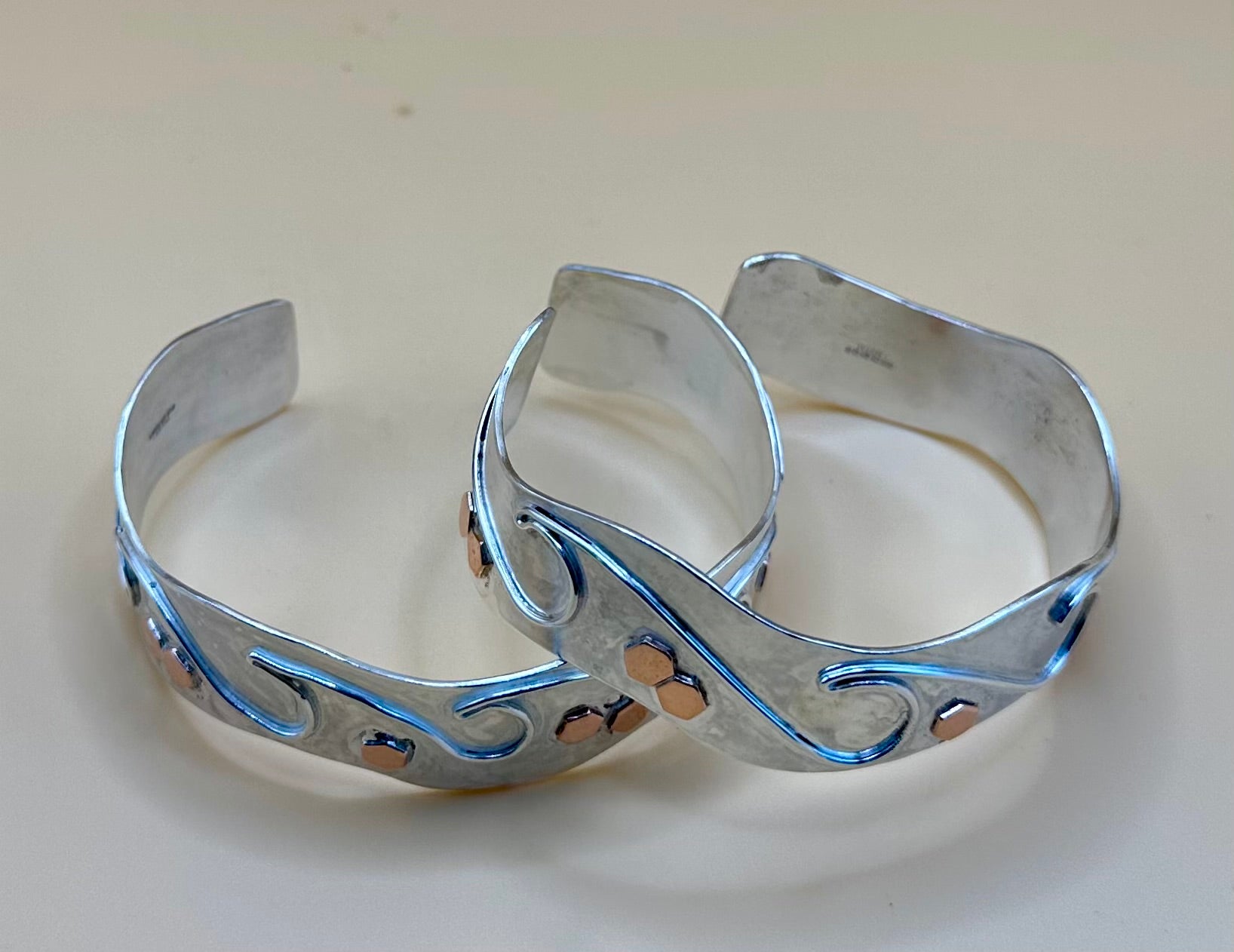 Sterling silver bangles, inspired by the Causeway Coast of Northern Ireland, these bangles include a wave design and hexagonal copper additions.