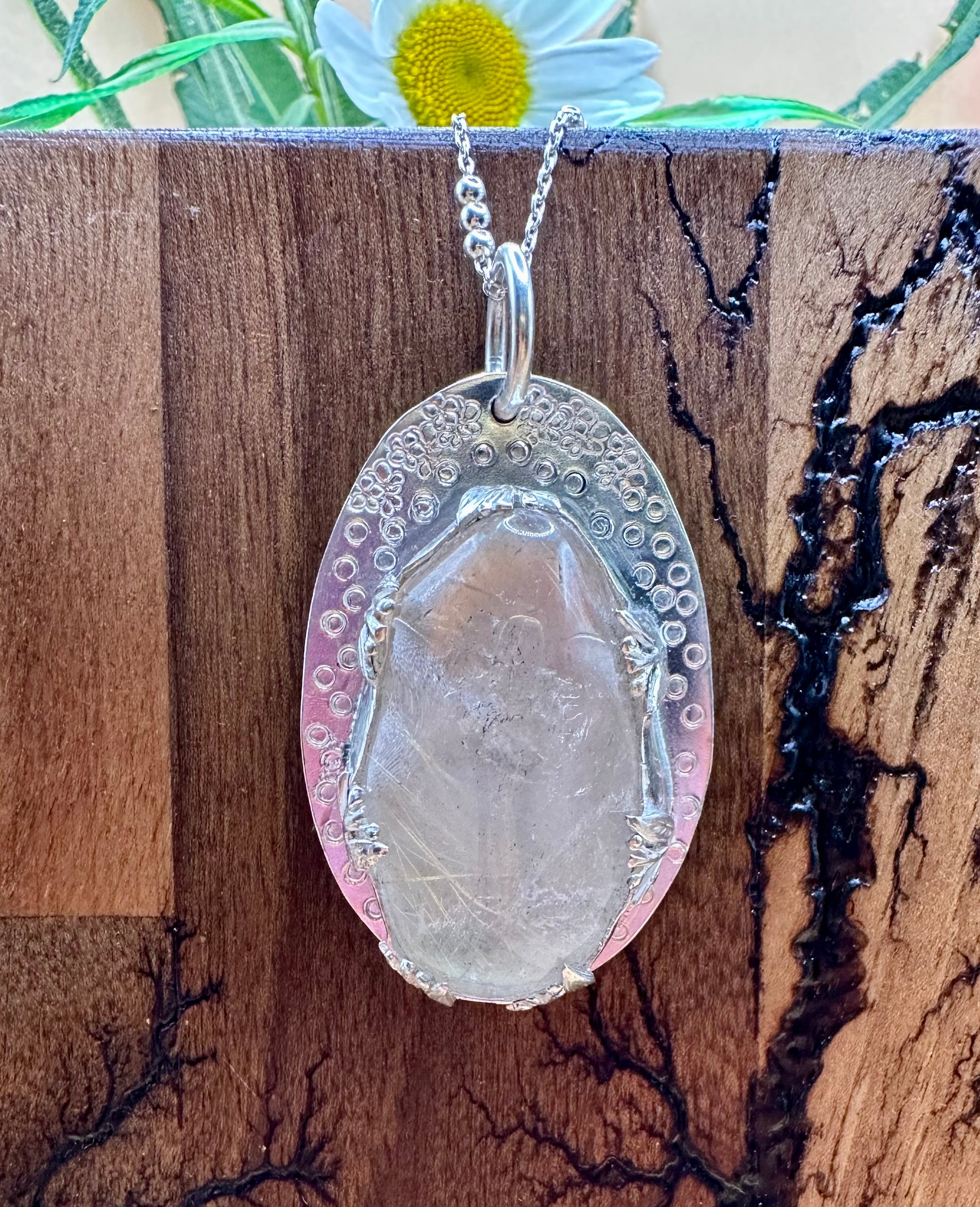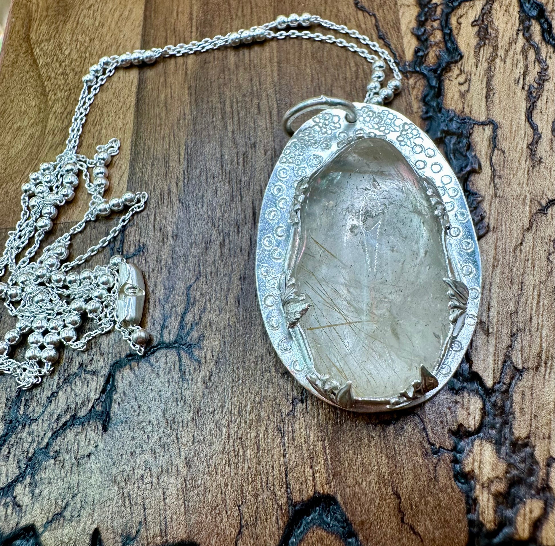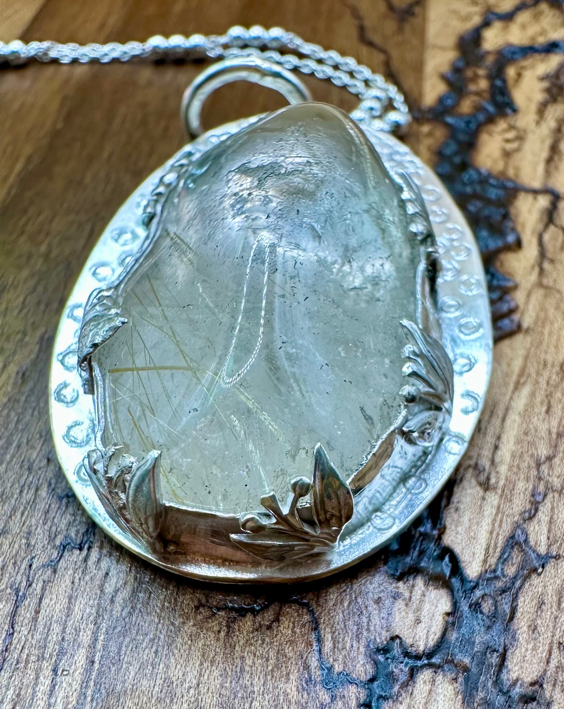 Beautiful rutilated quartz set into sterling silver floral setting. Hung on a pretty 24" sterling silver beaded chain.