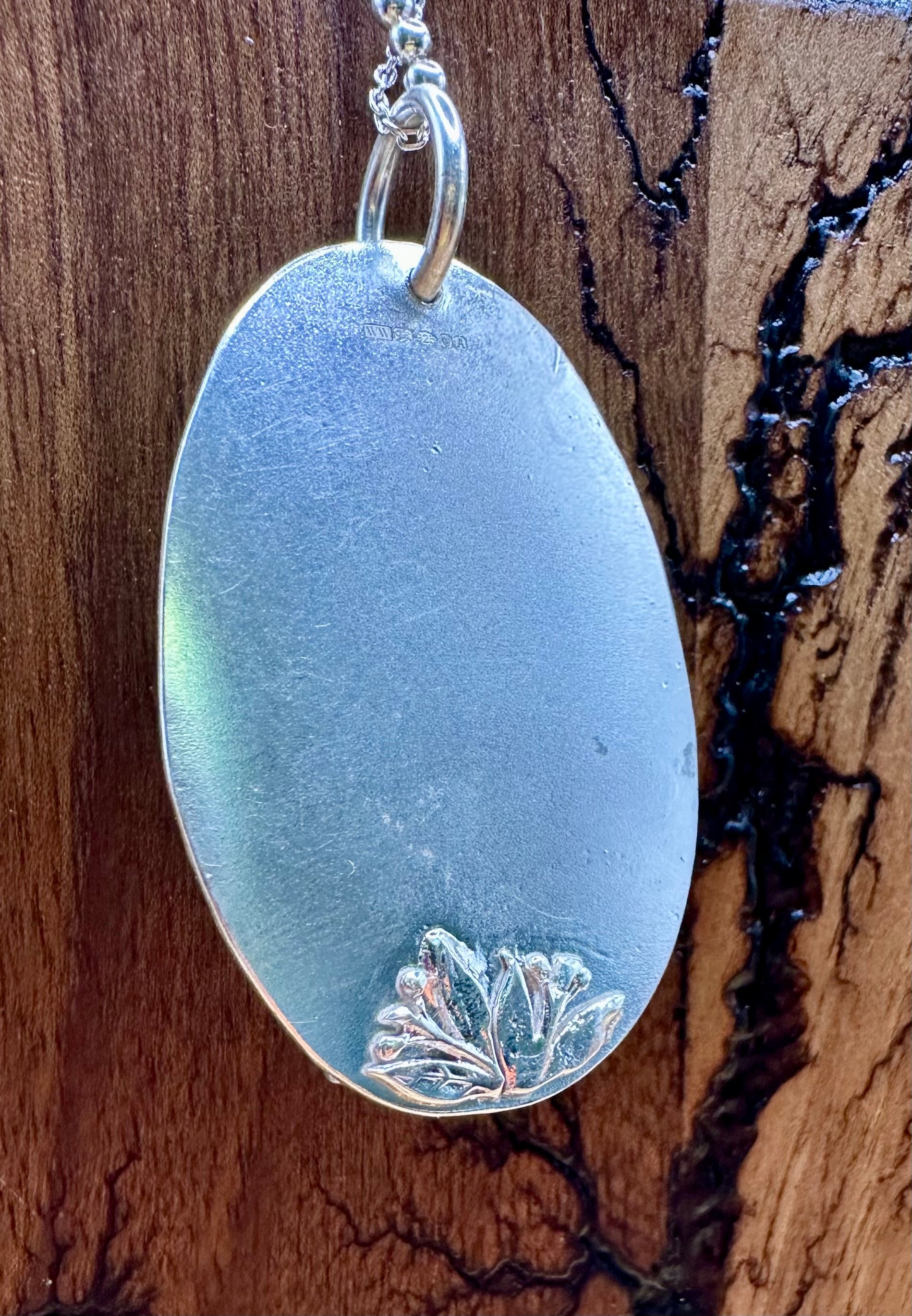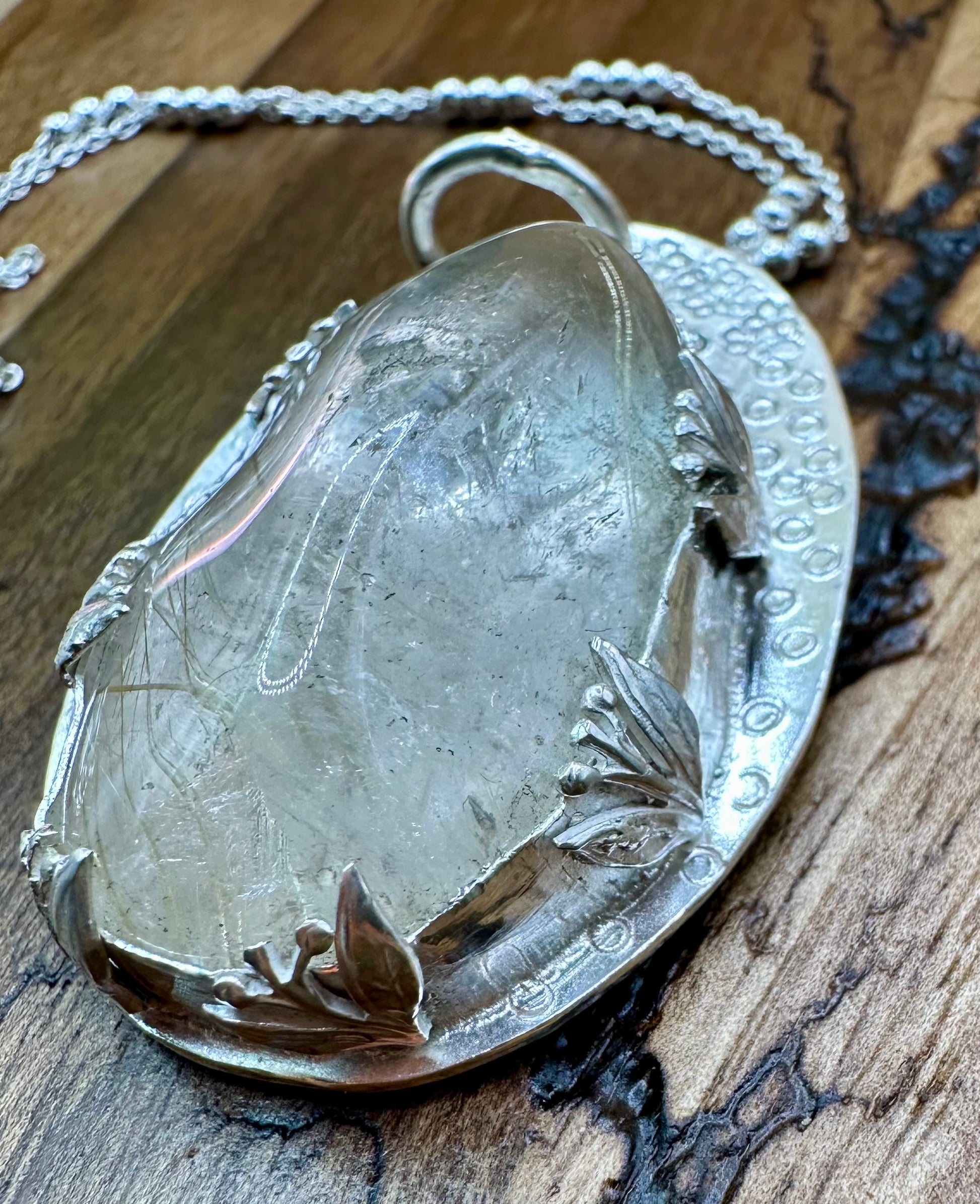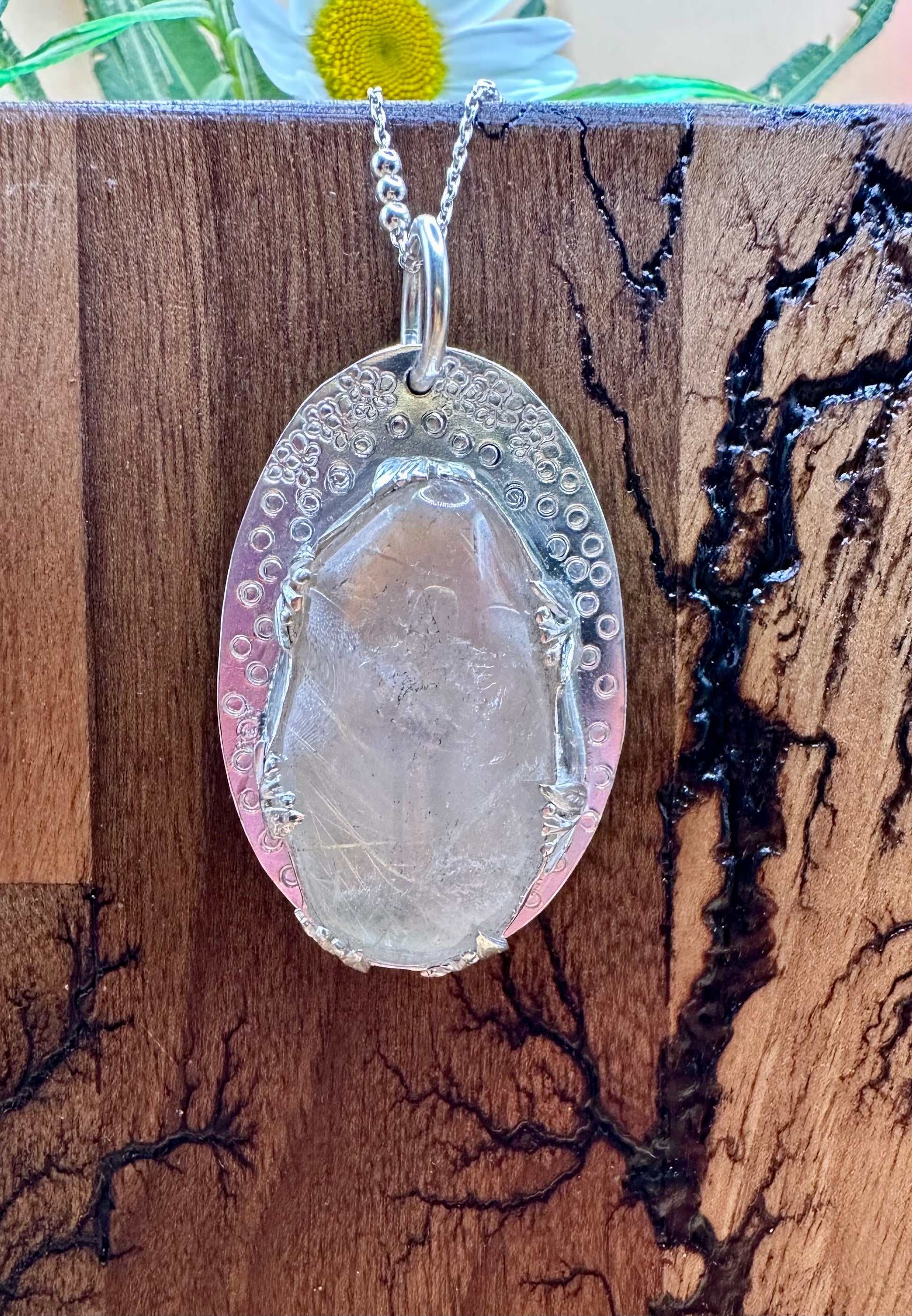 Beautiful rutilated quartz set into sterling silver floral setting. Hung on a pretty 24" sterling silver beaded chain.